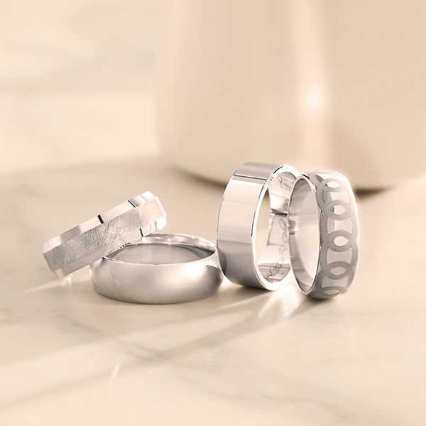 Modern, versatile, and enduring, our men’s white gold wedding bands offer a sleek alternative to tradition. With their cool luster and clean lines, these bands pair perfectly with both classic and contemporary styles.